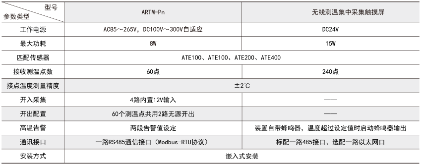 ARTM-Pn無線測溫裝置:ARTM-Pn無線測溫裝置可以單獨安裝在高壓柜、低壓抽屜柜內,每臺裝置可以接收18個傳感器的數據,傳感器型號可選配ATE100、ATE200、ATE300。裝置帶有一路485接口,可將采集到的溫度數據上傳到監控中心。
