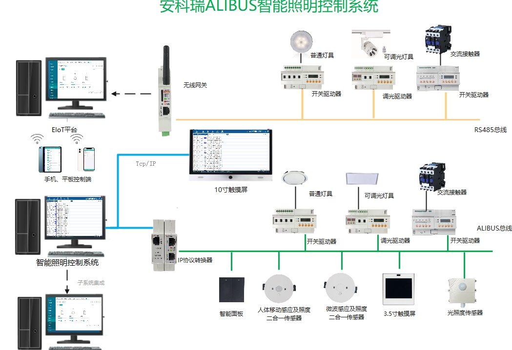 智能照明控制系統(tǒng)是安科瑞新一代自有知識(shí)產(chǎn)權(quán)的照明控制解決方案,基于成熟的RS485通訊控制技術(shù)。同時(shí)創(chuàng)新地引入了載波偵聽(tīng)和沖突碰撞檢測(cè)機(jī)制,多機(jī)間的實(shí)現(xiàn)了實(shí)時(shí)雙向通訊。線材使用的超六類(lèi)屏蔽網(wǎng)線,一次性解決通訊與供電問(wèn)題。整個(gè)系統(tǒng)由輸出設(shè)備、輸入設(shè)備和系統(tǒng)元件。輸出設(shè)備負(fù)責(zé)接收和處理傳感器傳送的信號(hào),并執(zhí)行相應(yīng)的操作,如開(kāi)/ 關(guān)燈、調(diào)節(jié)燈的亮度。輸入設(shè)備負(fù)責(zé)根據(jù)現(xiàn)場(chǎng)手動(dòng)操作,或探測(cè)光線、人體運(yùn)動(dòng)等變化,向驅(qū)動(dòng)器發(fā)出相應(yīng)的控制信號(hào)。系統(tǒng)元件主要負(fù)責(zé)搭建系統(tǒng)平臺(tái),如IP協(xié)議轉(zhuǎn)換器、中繼器等。