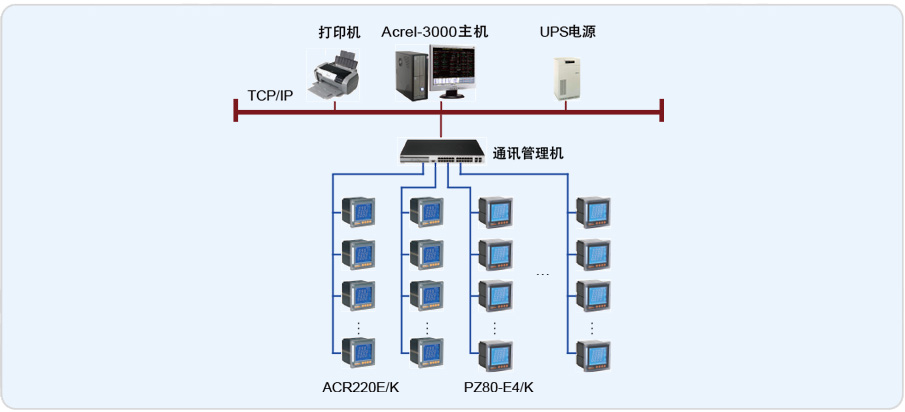 四川機(jī)械設(shè)計(jì)制造研究所主站層位于一層總值班室內(nèi),電力監(jiān)控系統(tǒng)的站控管理層設(shè)備具體包括:Acrel-2000電力監(jiān)控系統(tǒng)工控機(jī)一套、打印機(jī)、UPS。負(fù)責(zé)將通訊管理層上傳的數(shù)據(jù)解包,進(jìn)行集中管理和分析,執(zhí)行相關(guān)操作、以及整個(gè)變配電系統(tǒng)的整體監(jiān)控。網(wǎng)絡(luò)通訊層設(shè)備的選型主要從兩個(gè)方面考慮,一個(gè)是用戶需求,功能實(shí)現(xiàn)方面;二是根據(jù)現(xiàn)場(chǎng)情況,綜合項(xiàng)目的費(fèi)用來(lái)考慮的。針對(duì)這個(gè)項(xiàng)目來(lái)說(shuō)網(wǎng)絡(luò)通訊層設(shè)備采用性價(jià)比高的4口帶隔離的通訊管理機(jī)。兩路進(jìn)線選擇的是安科瑞生產(chǎn)的ACR220E/K網(wǎng)絡(luò)電力儀表;出線回路選擇的是安科瑞生產(chǎn)的PZ80-E4/K。