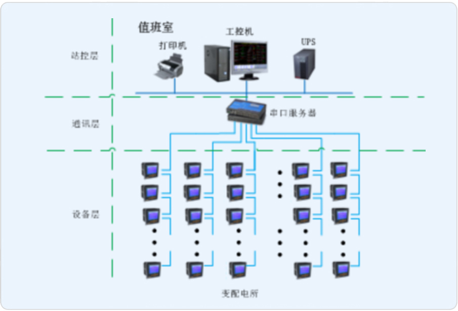 本項(xiàng)目設(shè)計(jì)為變配電所部分電力監(jiān)控系統(tǒng),變配電所位于地下一層,其中有兩路高壓進(jìn)線,配有綜合保護(hù)裝置,低壓部分,進(jìn)線柜、饋線柜配有儀表,本電力監(jiān)控系統(tǒng)監(jiān)控范圍為低壓部分裝置。通過組建系統(tǒng)網(wǎng)絡(luò),電力儀表通過現(xiàn)場(chǎng)總線直接接入變電所內(nèi)采集設(shè)備,并將數(shù)據(jù)上傳至Acrel-2000電力監(jiān)控系統(tǒng),實(shí)時(shí)監(jiān)測(cè)變電所內(nèi)各個(gè)回路的電流、電壓、功率、開關(guān)狀態(tài)等電參量,由此達(dá)到變電所少人值守或無人值守的智能化管理。