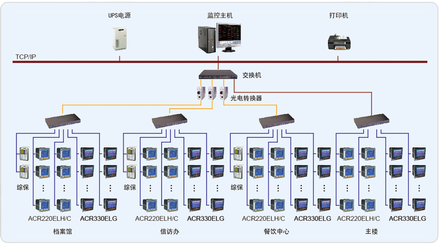該項(xiàng)目采用Acrel-2000電力監(jiān)控系統(tǒng)實(shí)現(xiàn)了海門(mén)行政中心4座樓內(nèi)(主 樓、A樓、B樓、H樓)電力系統(tǒng)的智能管理。項(xiàng)目值班室位于主樓負(fù)一層變配電室內(nèi),主樓變配電室主要設(shè)備是:ACR220EL/KC、ACR330EL/KC可編程智能電測(cè)表共96塊,配置一臺(tái)工業(yè)網(wǎng)絡(luò)交換機(jī);A樓變配電室主要設(shè)備是:ACR220EL/KC可編程智能電測(cè)表共63塊,現(xiàn)場(chǎng)采用8根總線,使用一臺(tái)8口的串口服務(wù)器,通過(guò)光纖連接至主樓值班室內(nèi)的交換機(jī)上;B樓變配電室主要設(shè)備是:ACR220EL/KC可編程智能電測(cè)表共59塊,現(xiàn)場(chǎng)采用6根總線,使用一臺(tái)8口的串口服務(wù)器,通過(guò)光纖連接至主樓值班室內(nèi)的交換機(jī)上;H樓變配電室主要設(shè)備是:ACR220EL/KC可編程智能電測(cè)表共105塊,采用5根總線,使用一臺(tái)8口的串口服務(wù)器,通過(guò)光纖連接至主樓值班室內(nèi)的交換機(jī)上;再通過(guò)交換機(jī)把數(shù)據(jù)傳輸?shù)焦た貦C(jī)。上述設(shè)備均相互獨(dú)立完成各自的功能,不依賴(lài)主控計(jì)算機(jī)運(yùn)行,具備RS-485 通信接口,通過(guò)現(xiàn)場(chǎng)的RS-485總線將檢測(cè)到的各項(xiàng)電參數(shù)和狀態(tài)信號(hào)實(shí)時(shí)傳輸?shù)街虚g層的數(shù)據(jù)處理單元—串口服務(wù)器。