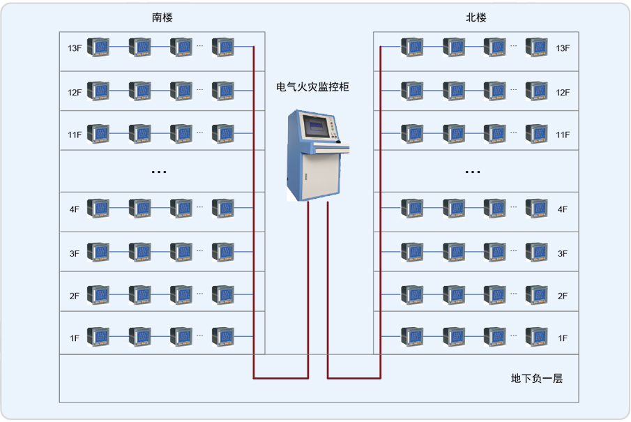 現場設備層是數據采集終端,主要由ARCM100-Z剩余式電氣火災監控探測器。可監測漏電流,各相電纜溫度信號,每路通道具有斷線、短路檢測功能;具有事件存儲功能,報警器能夠記錄報警發生的時間、類型、參數,根據報警記錄可以分析現場的用電情況,為消除故障提供依據;采用現場總線通信技術,上位機管理軟件可以時刻監控現場的運行情況,及時發現報警信息。現場總線連接的分布式I/O控制器構成數據采集終端,向數據中心上傳采集的數據。