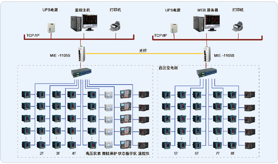 本監(jiān)控系統(tǒng)主要實現(xiàn)中科院蘇州醫(yī)工所的10/0.4kV配電系統(tǒng)進行用電監(jiān)測與電能管理;監(jiān)測范圍為一樓變電所的T3、T4變壓器進線柜,聯(lián)絡(luò)柜,溫控儀和二樓變電所的T1、T2變壓器進線柜,聯(lián)絡(luò)柜,溫控儀,高壓側(cè)儀表及綜保進行遠程實時監(jiān)控和電能管理。該系統(tǒng)總計有110只儀表(其中包括100只ACR220E,6只ABB,4只溫控儀),分7條總線,其中一樓變電所3條總線,二樓變電所4條總線,兩變電所都是直接通過屏蔽雙絞線走橋架拉至值班室連接到串口服務(wù)器,再通過網(wǎng)線連接至監(jiān)控主機實現(xiàn)總線上儀表與監(jiān)控主機的數(shù)據(jù)連通。