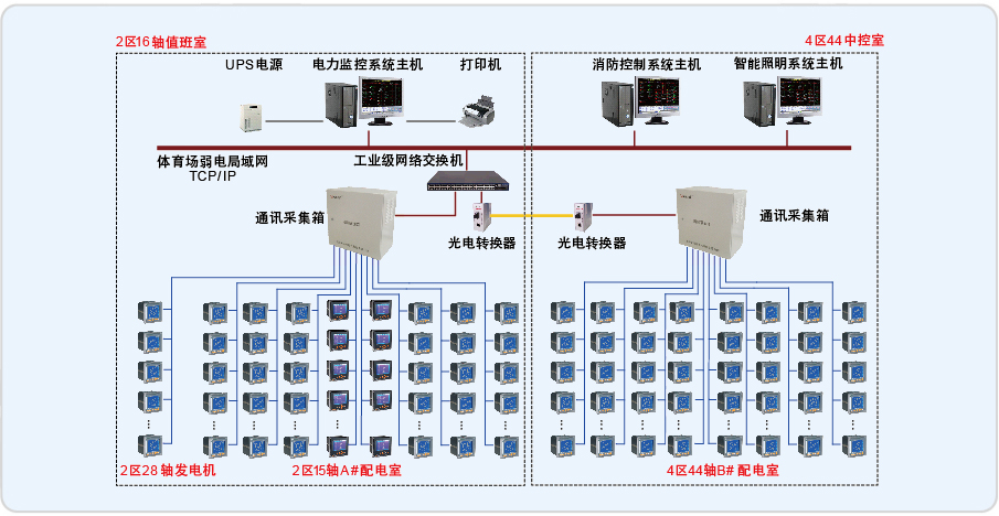 體育場(chǎng)變配電系統(tǒng)60kV以上部分由贊方提供,低壓系統(tǒng)主要變電設(shè)備為4臺(tái)1600kW干式變壓器和一臺(tái)1600kW應(yīng)急柴油發(fā)電機(jī),分別位于2區(qū)15軸、2區(qū)28軸和4區(qū)44軸配電室的內(nèi),共27臺(tái)低壓配電柜,116個(gè)配電回路。本電力監(jiān)控系統(tǒng)為三層結(jié)構(gòu),現(xiàn)場(chǎng)設(shè)備層由安裝在低壓配電柜上的多功能儀表組成,經(jīng)由9根RS485總線上傳數(shù)據(jù)。通訊管理層由安裝在15軸監(jiān)控室和44軸B#配電室通訊機(jī)柜內(nèi)的通訊服務(wù)器、光電轉(zhuǎn)換器和工業(yè)以太網(wǎng)交換機(jī)等設(shè)備組成,其功能是連接現(xiàn)場(chǎng)設(shè)備層和站控管理層。站控管理層設(shè)備(監(jiān)控主機(jī)、UPS電源、顯示器等)均安裝在15軸監(jiān)控室的通訊采集箱內(nèi)。