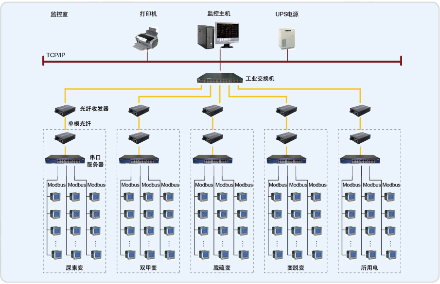 中化平原電力監(jiān)控系統(tǒng)現(xiàn)場分為5個低壓配電室,配電室內(nèi)采用安科瑞PZ系列電力監(jiān)控儀表采集各回路的電流、電壓、電能等電參量,然后通過中間層采集設(shè)備經(jīng)光纖傳到監(jiān)控室計(jì)算機(jī)上,實(shí)現(xiàn)遙測、遙信功能。