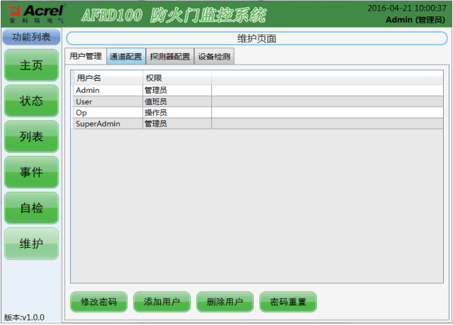 該界面設有三種操作級別,操作權限級別依次為“超級管理員”→“管理員”→“操作員”,其中高級別可添加低級別的新用戶。