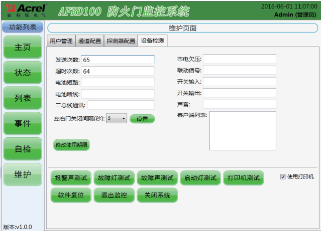 該界面可以直接查看和設置一些系統運行參數,獨立測試監控器部分功能,但只有“管理員”及其以上級別才有操作權限。