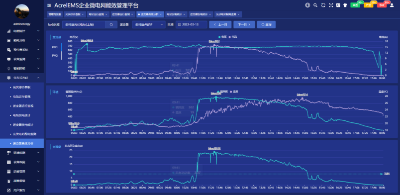 展示逆變器直流側電壓、電流曲線,交流側功率曲線以及環境輻照度曲線、溫度曲線。便于用戶進行整體分析。
