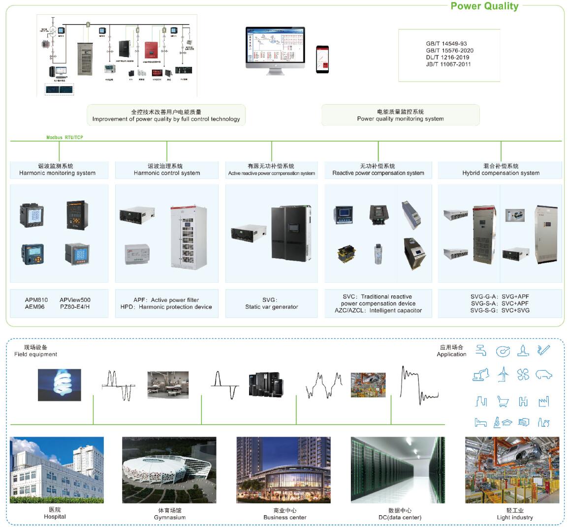 電能質(zhì)量分析與治理系統(tǒng)主要是研究消除供配電系統(tǒng)中的無功補償和諧波治理問題,主要的產(chǎn)品有有源電力濾波器、低壓無功功率補償裝置、靜止無功發(fā)生器、混合動態(tài)濾波補償裝置、混合動態(tài)消諧補償裝置、智慧型動態(tài)無功補償裝置、諧波保護器等,適用于新建、改建、擴建和技改項目中工業(yè)與民用及公共建筑內(nèi)電氣設(shè)備的無功補償、諧波抑制及綜合治理等,可根據(jù)不同行業(yè)類型和負(fù)載類型的電能質(zhì)量問題提供合適的設(shè)計解決方案,以達(dá)到改善供電質(zhì)量和確保電力系統(tǒng)安全經(jīng)濟運行的目的。