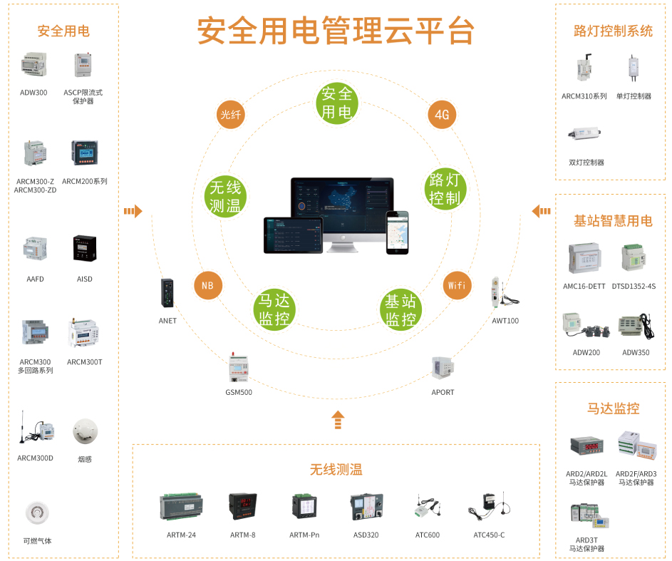 基于安全用電云平臺,演化出了無線測溫,基站智慧用電,路燈控制系統(tǒng)和馬達(dá)監(jiān)控云平臺。