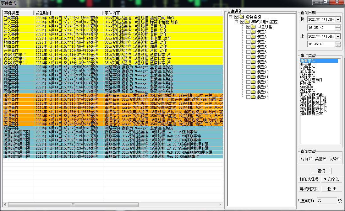 Acrel-1000綜合自動化監控系統能夠對遙信變位,保護動作、事故跳閘,以及電壓、電流、功率、功率因數越限等事件記錄進行存儲和管理,方便用戶對系統事件和進行歷史追溯、查詢統計、事故分析。可以按時間、類型和設備進行查詢和排序。