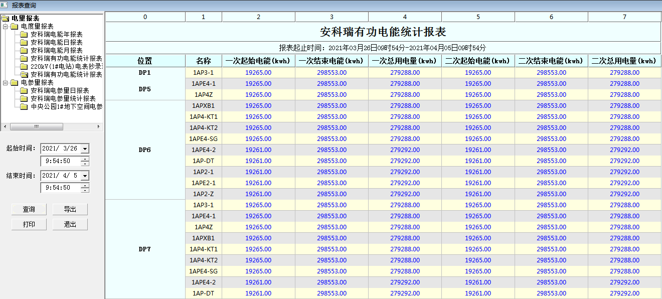 Acrel-1000綜合自動化監控系統具備定時抄表匯總統計功能,用戶可以自由查詢自系統正常運行以來任意時間段內各配電節點的用電情況,即該節點進線用電量與各分支回路消耗電量的統計分析報表。