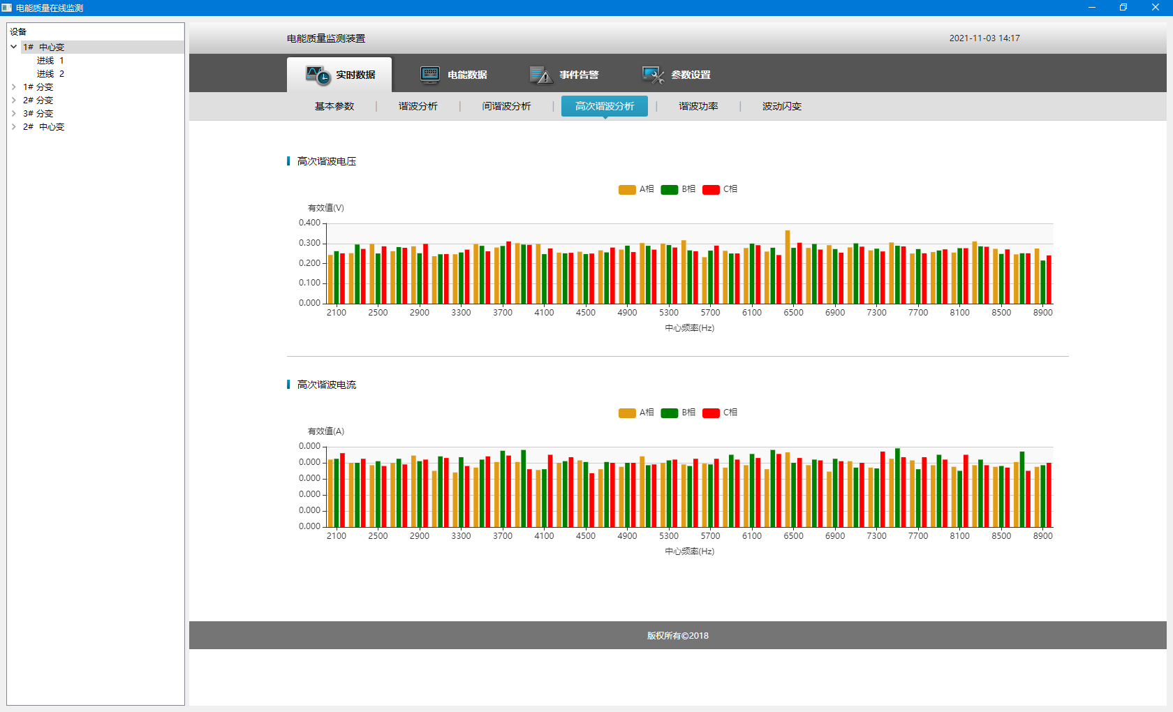 實時監測總進線和重要出線回路的供電電源電能質量,包括穩態數據監測、暫態數據監測和故障錄波分析。對供電系統中的電壓偏差、頻率偏差、三相電壓不平衡、三相電流不平衡、2~63次諧波電壓、2~63次諧波電流、0.5~63.5次間諧波電壓、0.5~63.5次間諧波電流、諧波功率、諧波畸變率等實時監測,并以柱狀圖進行諧波分析。