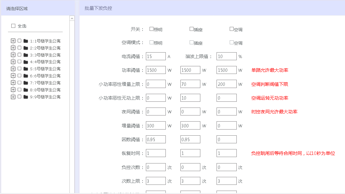 限制學(xué)生使用違章電器,當(dāng)接入未經(jīng)允許的違章電器時(shí),支路跳閘。空調(diào)模式:空調(diào)模式下,電表持續(xù)檢測空調(diào)微弱待機(jī)電流,一但存在拔斷空調(diào)插座的動(dòng)作,電表便跳閘,且只能通過聯(lián)系管理人員進(jìn)行合閘送電。允許除空調(diào)模式以外的跳閘動(dòng)作自動(dòng)合閘。允許次數(shù),跳閘等待時(shí)間可設(shè)置,支持批量設(shè)置。
