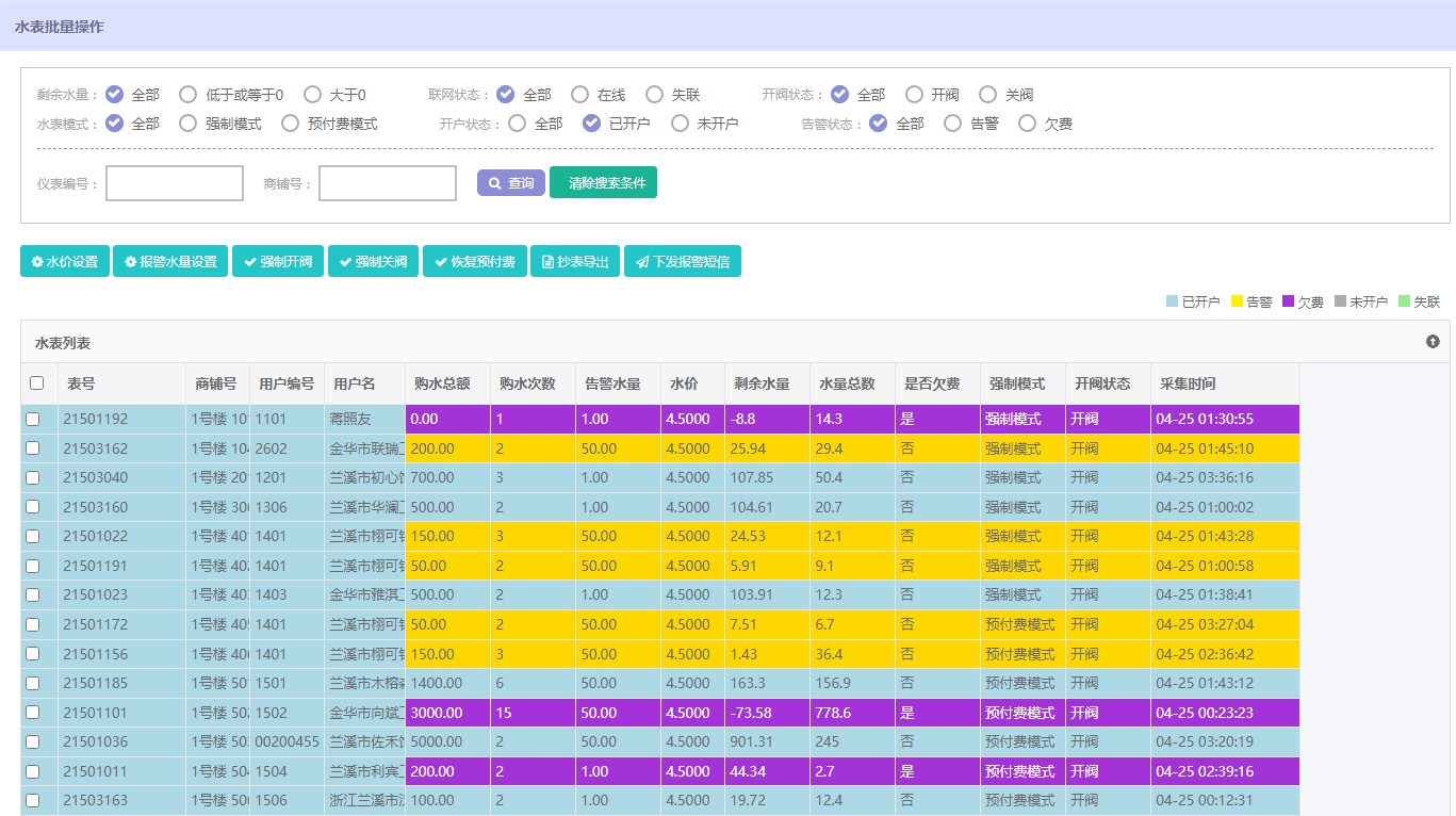 批量遠(yuǎn)程操作場景中,系統(tǒng)提供了多項(xiàng)功能,針對(duì)開戶、報(bào)警1、報(bào)警2、欠費(fèi)、未開戶、失聯(lián)狀態(tài)都有不同的顏色顯示:1.電價(jià)下發(fā);2.設(shè)置下發(fā);3.保電(強(qiáng)制合閘);4.恢復(fù)預(yù)付費(fèi)(欠費(fèi)自動(dòng)跳閘);5.拉閘(強(qiáng)制斷電);6.抄表導(dǎo)出(導(dǎo)出當(dāng)前所有表狀態(tài)為XLS)