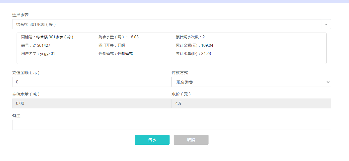 系統(tǒng)同樣支持水表的預(yù)付費(fèi)功能,通過選購我司合作品牌積成、巨靈、青島浪濤等水表,不僅支持普通188和ModBus協(xié)議的水表,也支持NB水表。