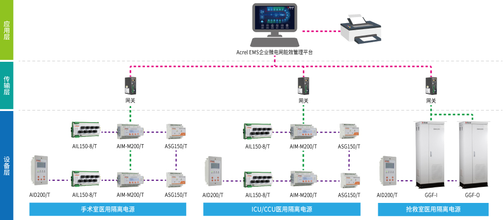 適用于醫(yī)院的手術(shù)室、各類重癥監(jiān)護(hù)室、搶救室、血透中心、內(nèi)窺鏡室及造影室等醫(yī)療2類場(chǎng)所的醫(yī)用隔離電源系統(tǒng)的遠(yuǎn)程監(jiān)控及自動(dòng)化管理。