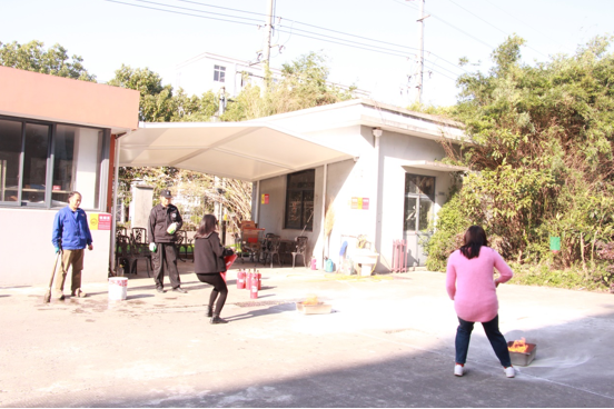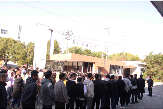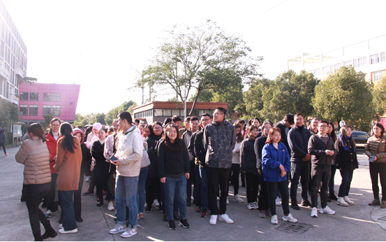 聽(tīng)到警報(bào),所有員工貓著腰,有序地逃生到門(mén)口的空地上,在寒風(fēng)中,大家整齊地進(jìn)行列隊(duì)報(bào)數(shù)。