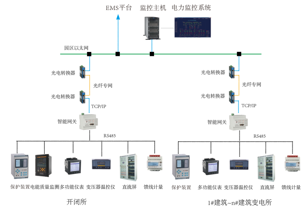 電力監(jiān)控系統(tǒng)實(shí)現(xiàn)對(duì)園區(qū)變電站、配電房內(nèi)斷路器、變壓器、柴油發(fā)電機(jī)以及其它重要設(shè)備進(jìn)行監(jiān)視、測量、記錄、報(bào)警等功能,并與保護(hù)設(shè)備和遠(yuǎn)方控制中心及其他設(shè)備通信,實(shí)時(shí)掌握?qǐng)@區(qū)變電站和配電房運(yùn)行狀況,快速排除故障,保障園區(qū)供電可靠性。
