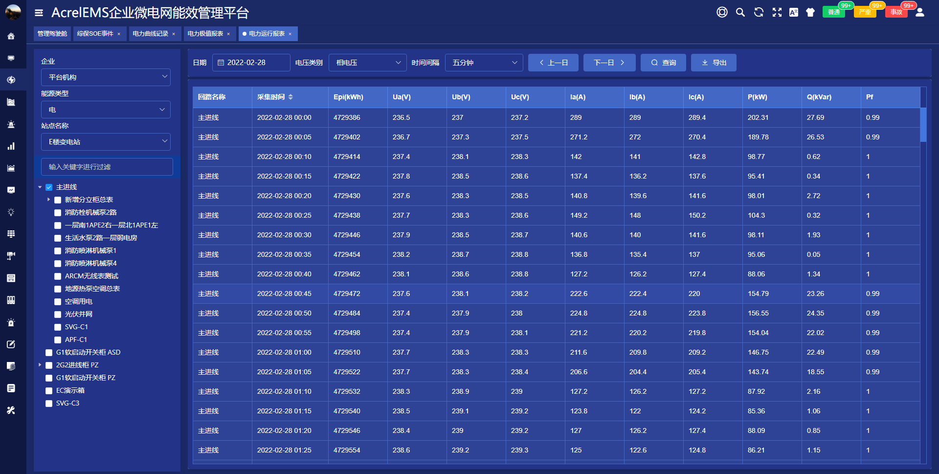 查詢各回路或設(shè)備指定時(shí)間的運(yùn)行參數(shù),報(bào)表中顯示電參量信息應(yīng)包括:各相電流、三相電壓、總功率因數(shù)、總有功功率、總無(wú)功功率、正向有功電能等.