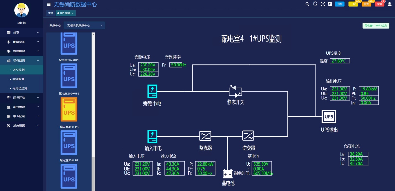 系統可以展示精密配電柜內進線和饋線回路電氣參數,包括電流電壓功率電能以及開關狀態,并可以對數據進行報警設置和分級,數據取自精密配電柜測量模塊。