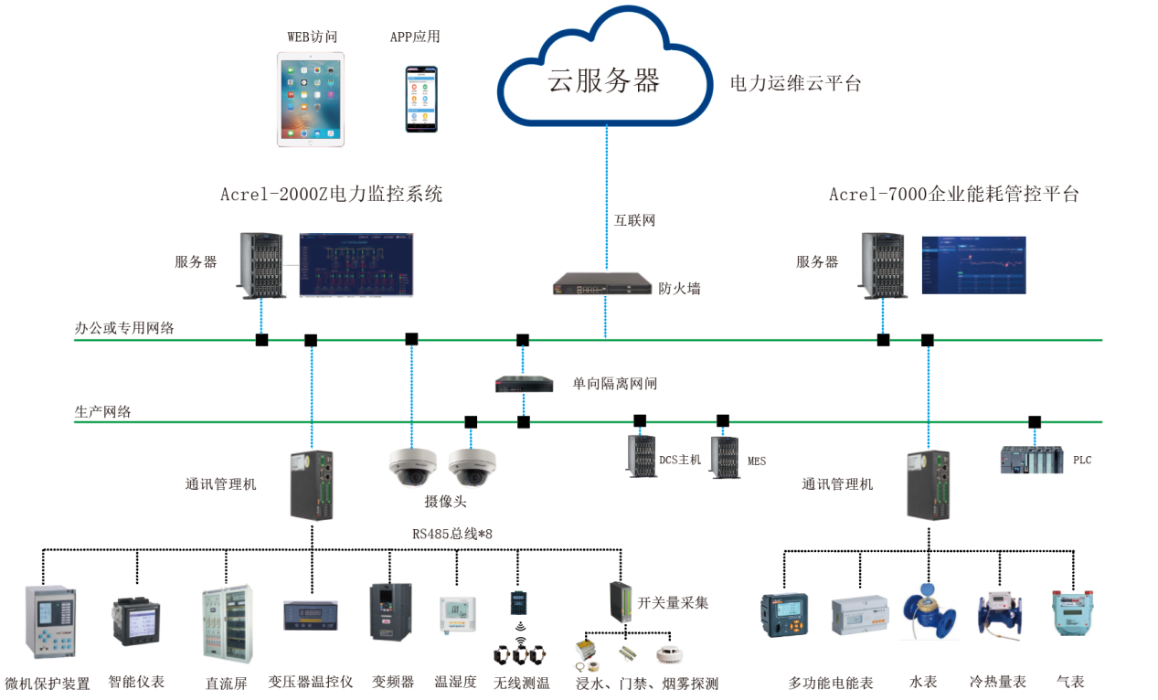 系統采用分布式結構,微機保護裝置、多功能儀表、變壓器溫控器、直流屏、柴油發電機控制屏等設備通過RS485總線或者以太網接入智能網關,經過協議轉換、數據處理后上傳至電力監控系統,實現遙測、遙信、遙控、異常報警等功能。