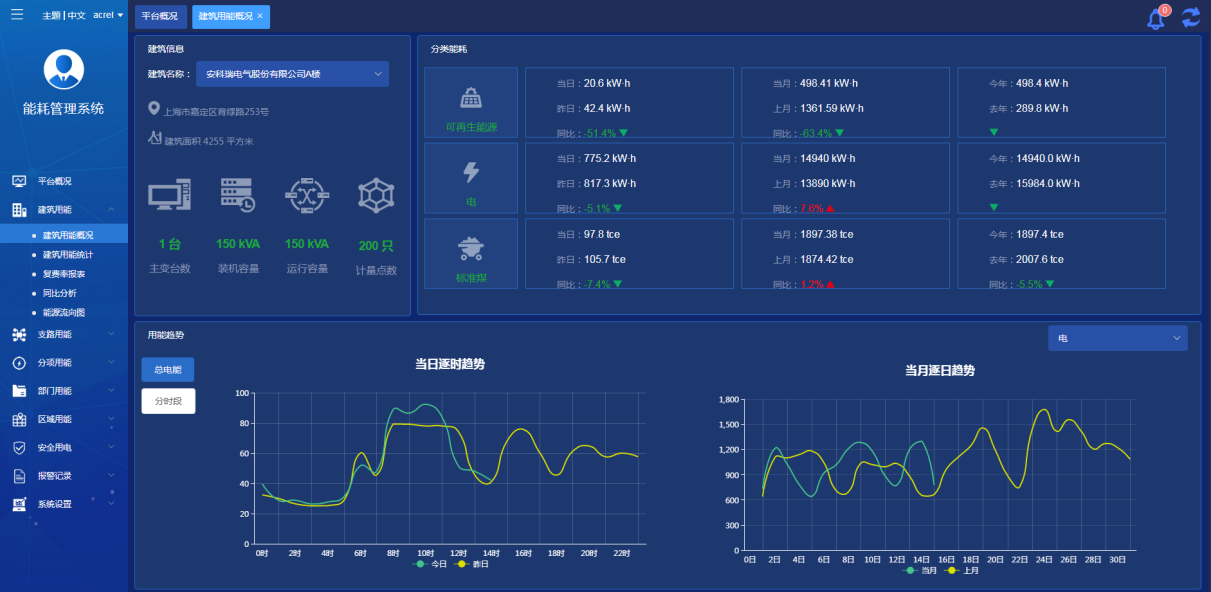 主要展示被選中建筑物基本信息,建筑各個分類用能對比,當日逐時趨勢,當月逐日趨勢和尖峰平谷分時段用能柱狀圖。能源類型可選擇電、水、可再生能源等等能源類型,并折算標煤。
