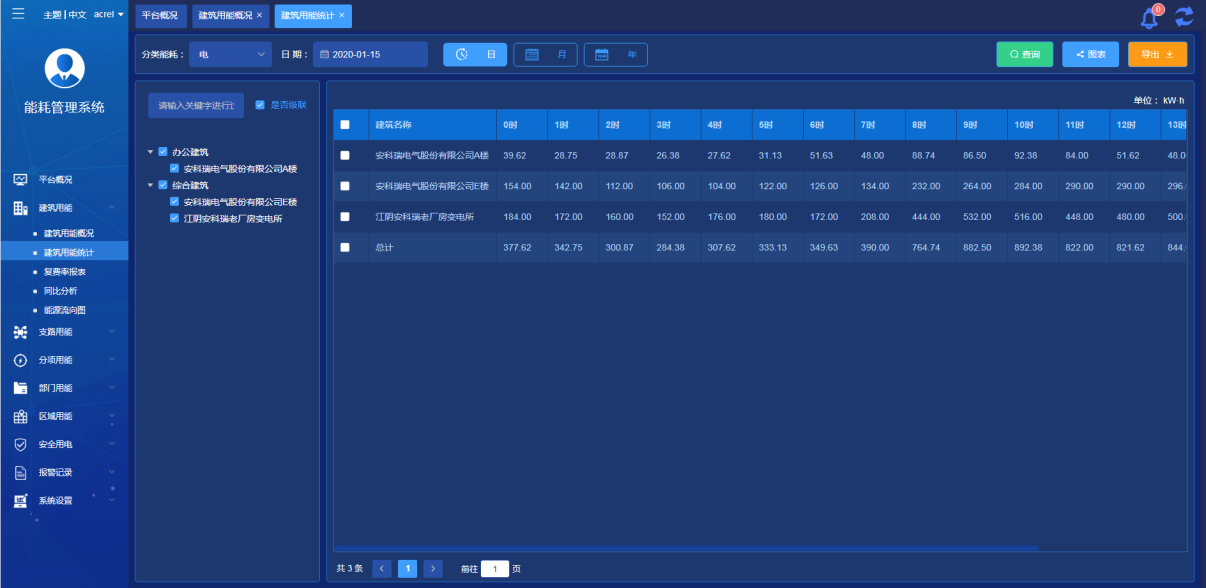 統(tǒng)計當前賬號下所有建筑日、月、年用能統(tǒng)計報表,可選擇以報表或者圖表方式顯示,可導出excel表格形式保存。