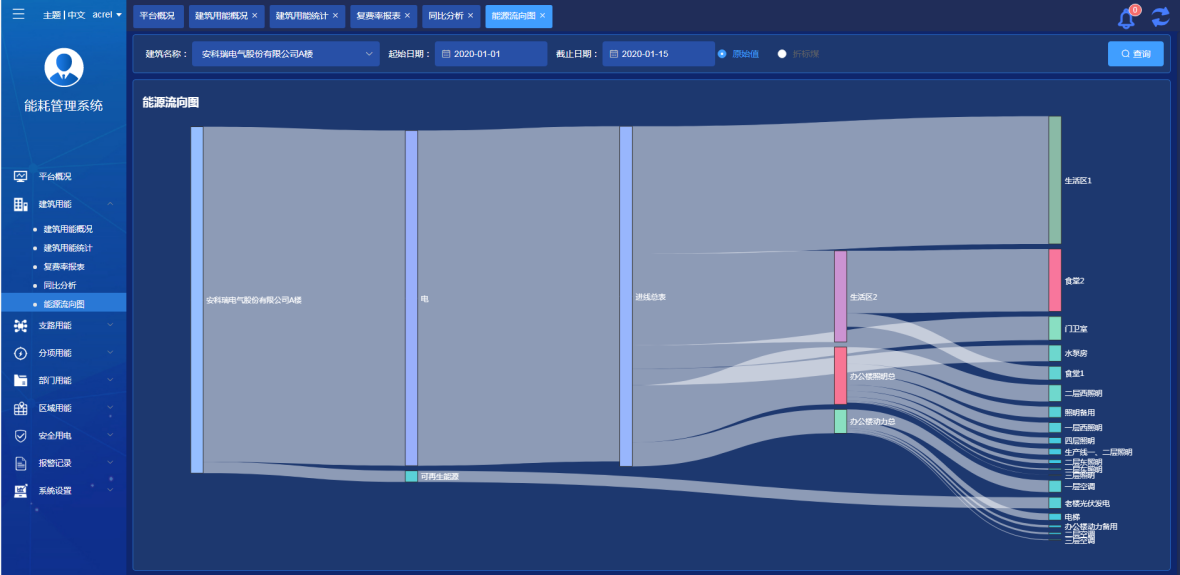 通過圖形方式直觀顯示當前建筑能源消耗流向,鼠標懸浮可以顯示當前區(qū)域或者回路的用能數據,起始日期和截止日期可選擇。