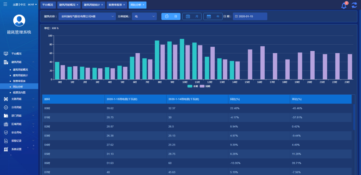 可選擇查看當前建筑用能數據同比和環(huán)比分析比較,可選擇日/月/年周期進行對比,通過柱狀圖和百分比數據顯示對比結果。