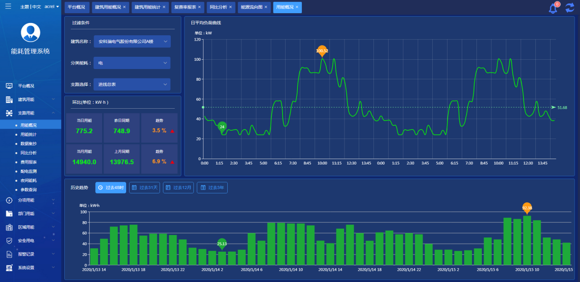 可選擇查看具體某個回路的能源消耗趨勢,包括日均負荷曲線展示、日月用能對比數據、過去48小時、過去31天、過去12個月、過去3年的能源消耗數據。