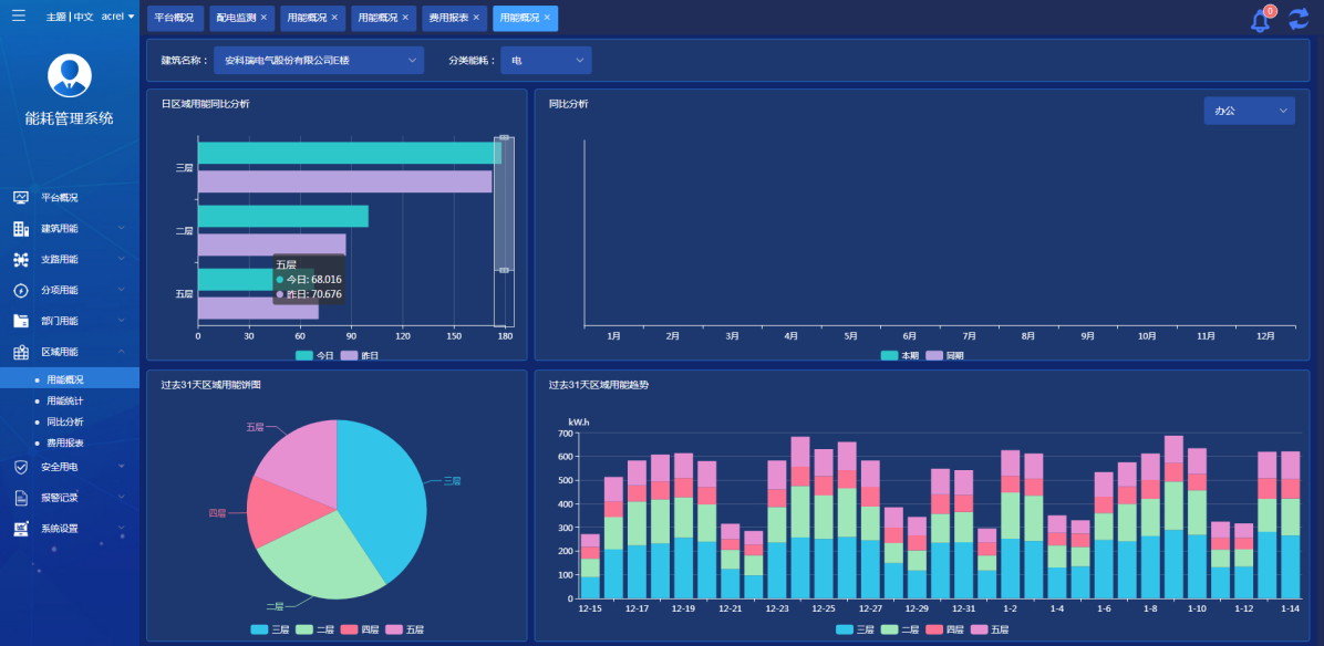 展示當前建筑各區(qū)域的用能情況,通過餅圖、柱狀圖顯示能源占比、同比對比以及分項用能趨勢,可按照樓、樓層等方式區(qū)分。