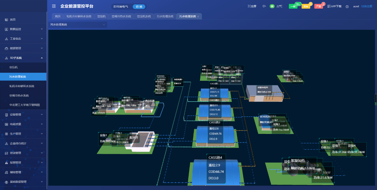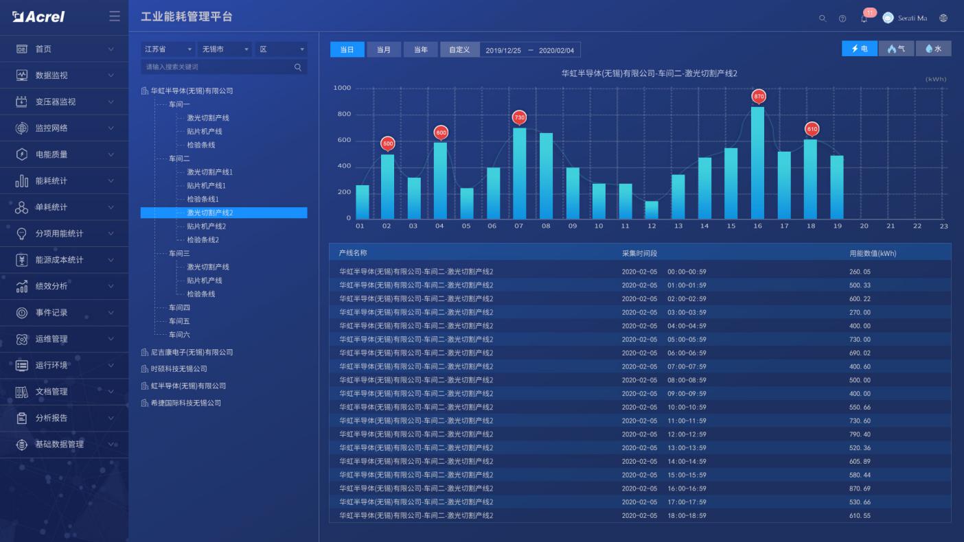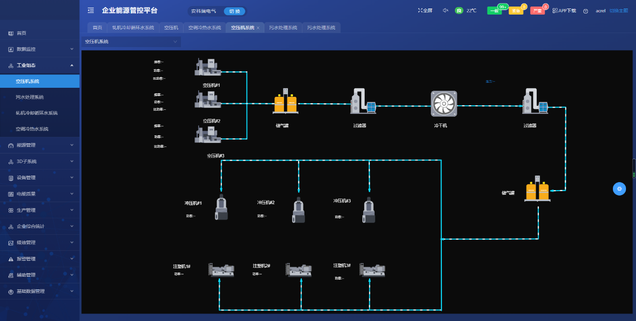 系統(tǒng)對(duì)區(qū)域、工段、設(shè)備能源消耗進(jìn)行數(shù)據(jù)采集,監(jiān)測(cè)重點(diǎn)設(shè)備及工藝運(yùn)行狀態(tài),如溫度、濕度、流量、壓力、速度等,并支持變配電系統(tǒng)一次運(yùn)行監(jiān)視。可直接從動(dòng)態(tài)監(jiān)測(cè)平面圖快速瀏覽到所管理的能耗數(shù)據(jù),支持按能源種類、車間、工段、時(shí)間等維度查詢相關(guān)能源用量。