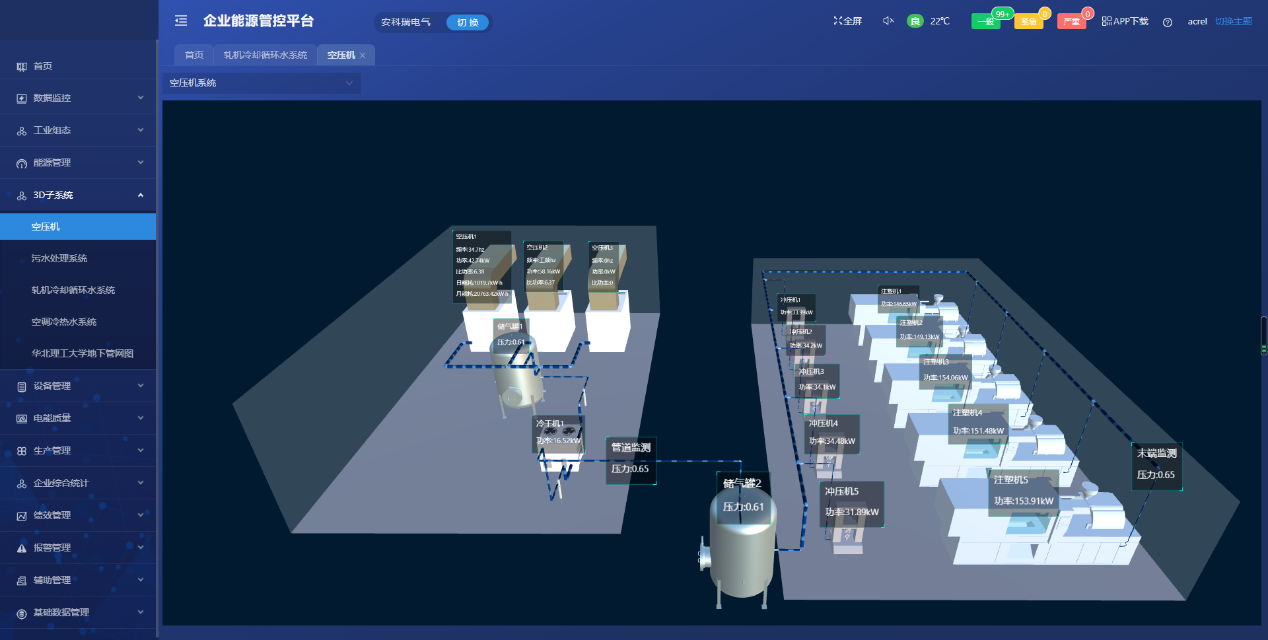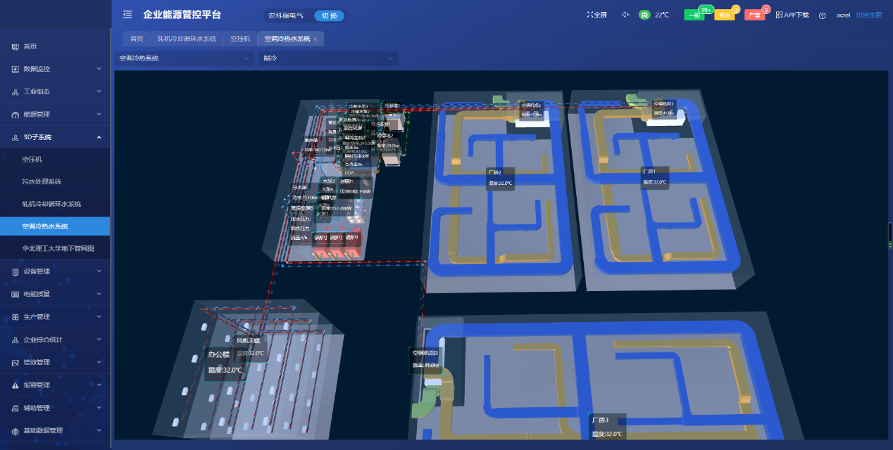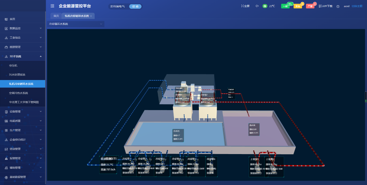 采集廠內(nèi)制冷系統(tǒng)、循環(huán)冷卻水系統(tǒng)、空壓機(jī)系統(tǒng)、污水處理系統(tǒng)等運(yùn)行數(shù)據(jù),可對(duì)運(yùn)行能效數(shù)據(jù)、歷史數(shù)據(jù)、實(shí)時(shí)數(shù)據(jù)、累計(jì)電量、功率、分時(shí)段(年、月、周、日)電量及功率進(jìn)行展示對(duì)比分析。