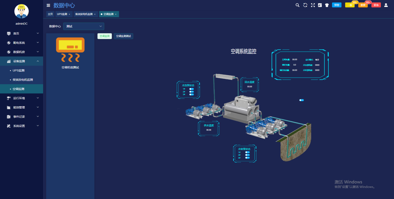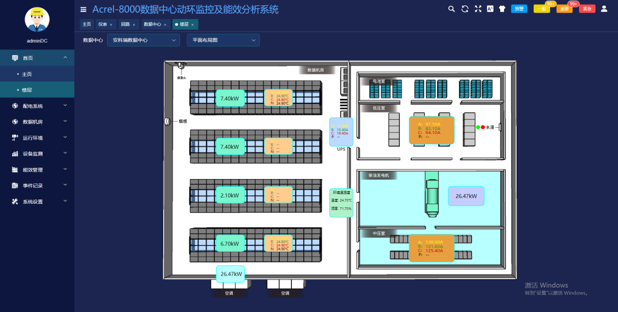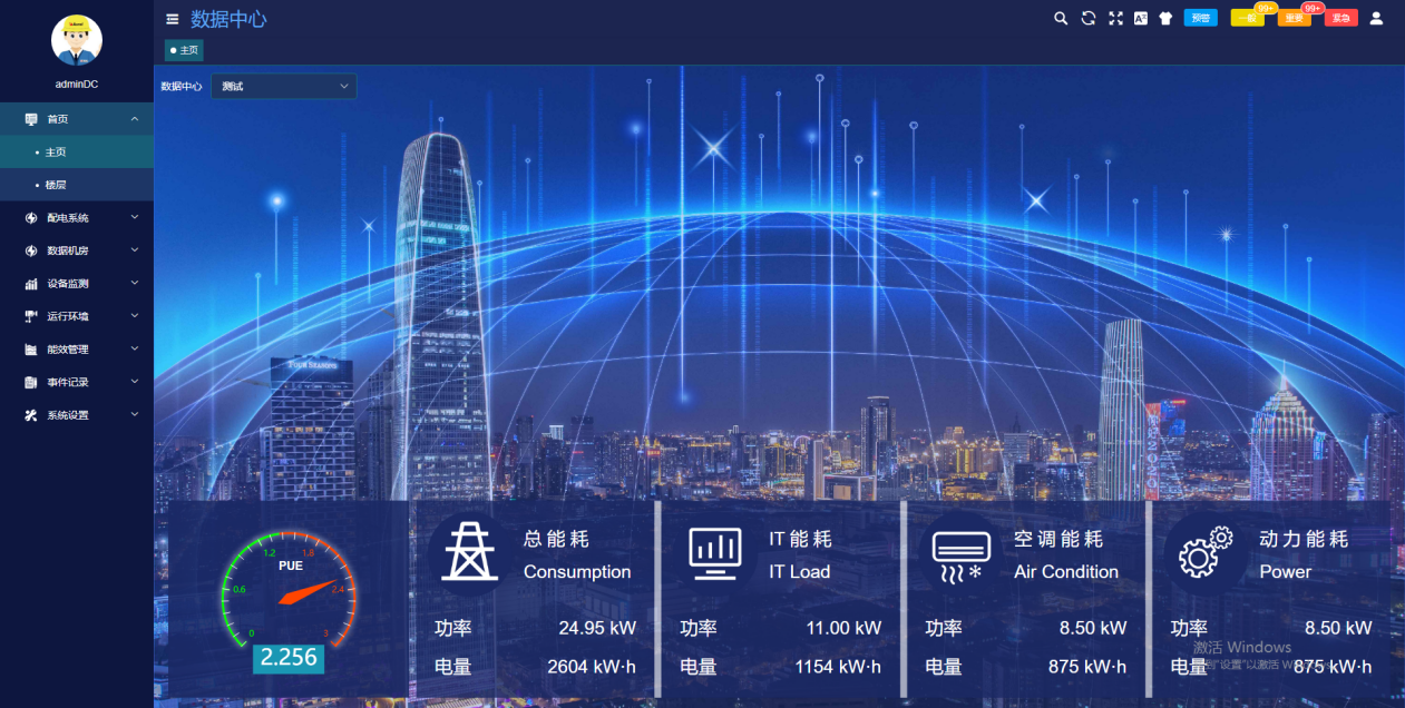 默認打開系統的“主頁”界面。顯示該數據中心的實時PUE值,總能耗,IT能耗,空調能耗,動力能耗。