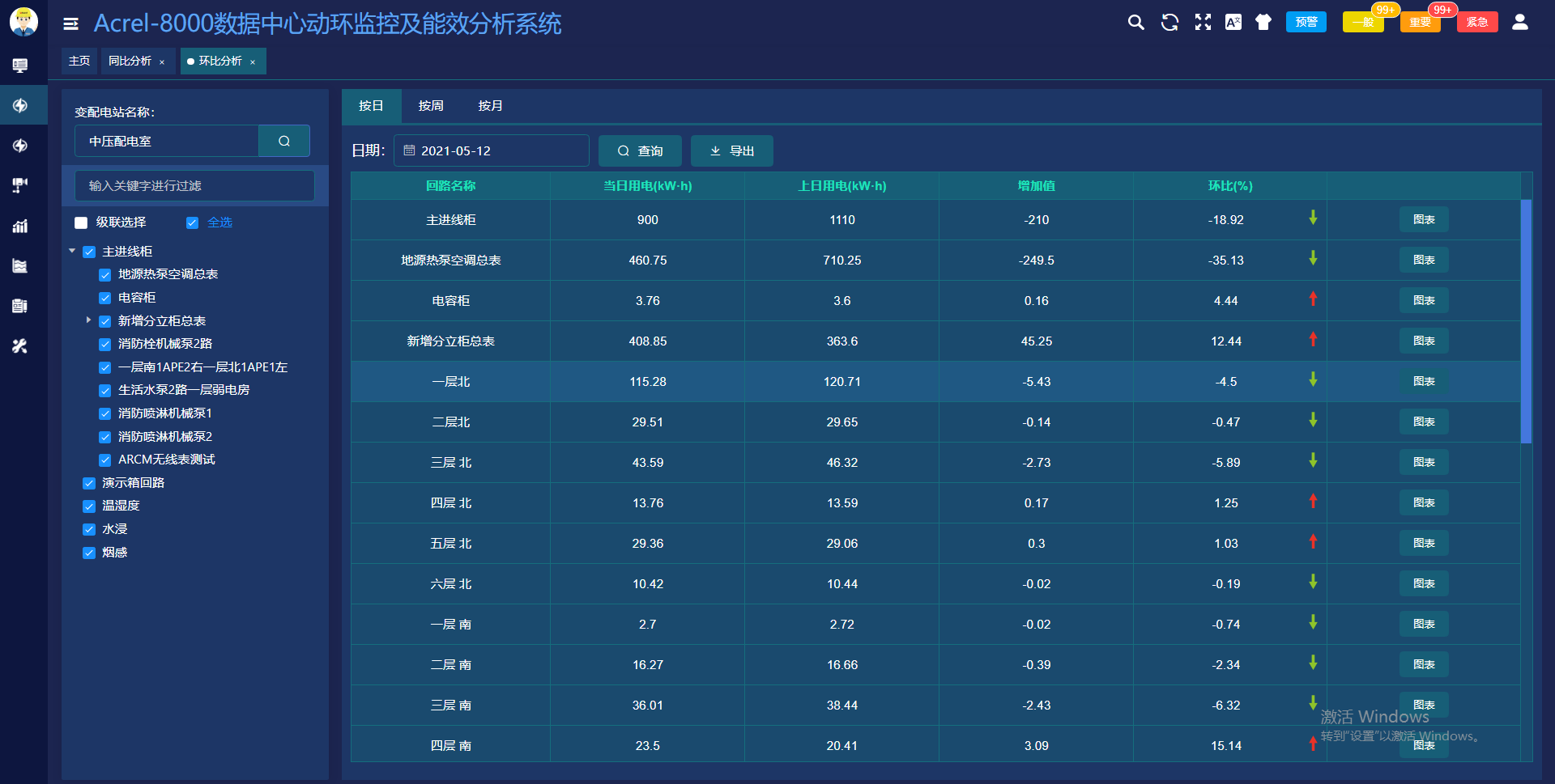 顯示各個用電回路。每日、每周、每月的環比用能情況。顯示增長或者下降比例。