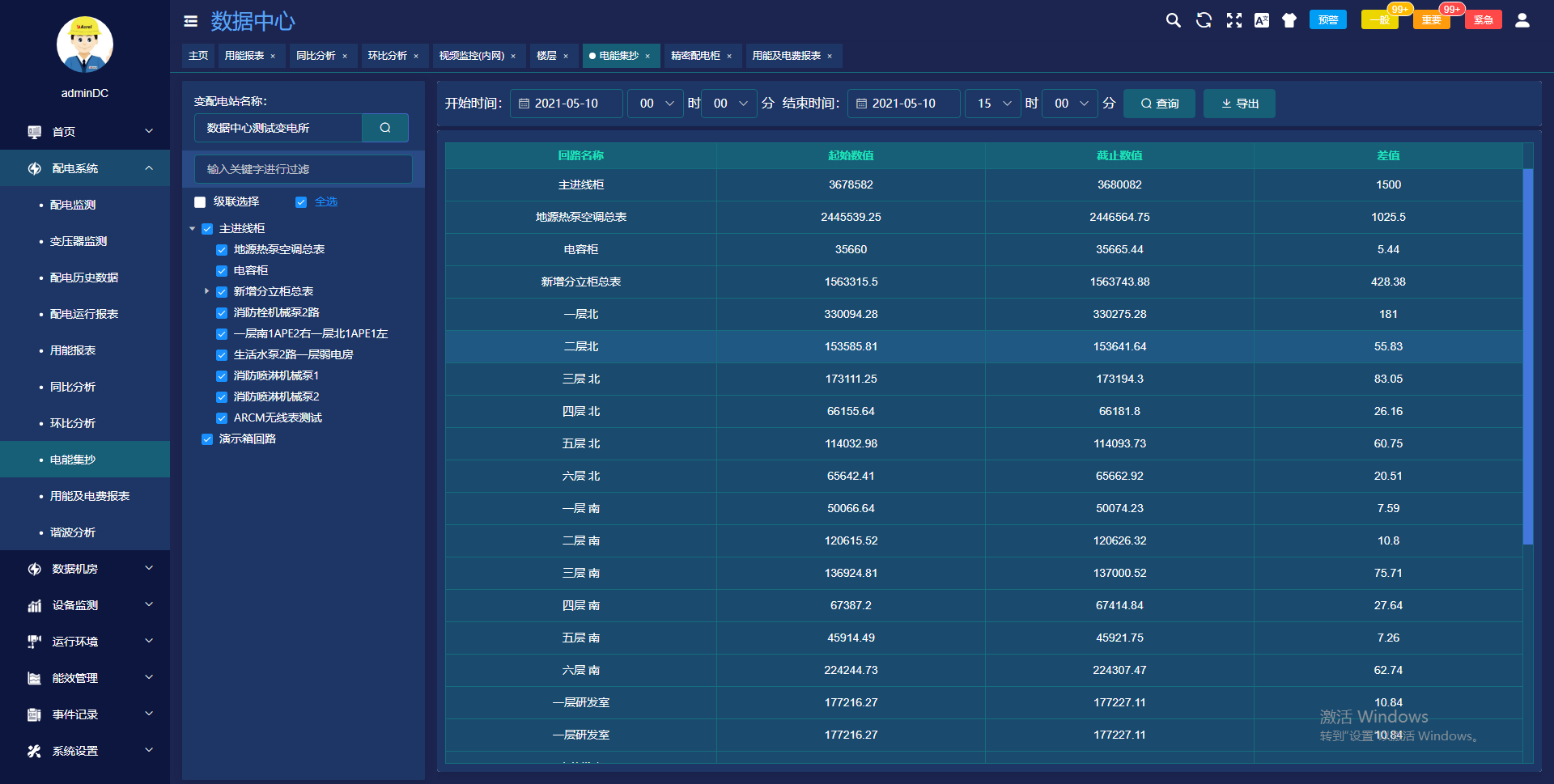本頁面顯示精密配電設備下所有分支回路的電力參數,支持歷史數據的查詢。如