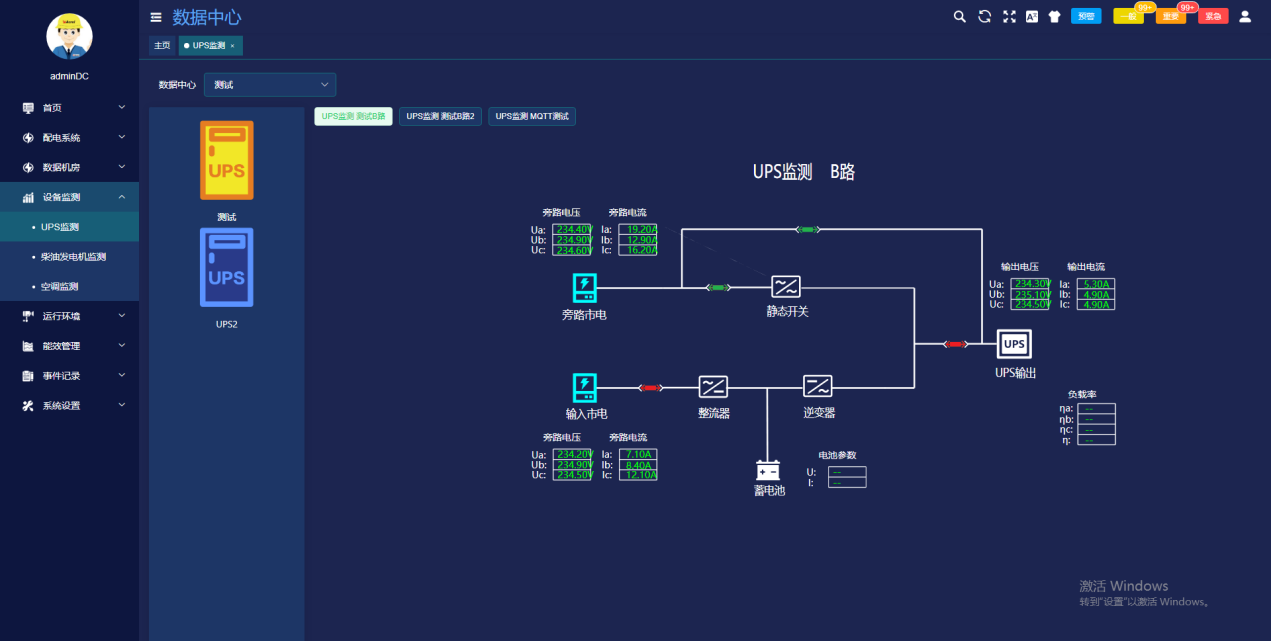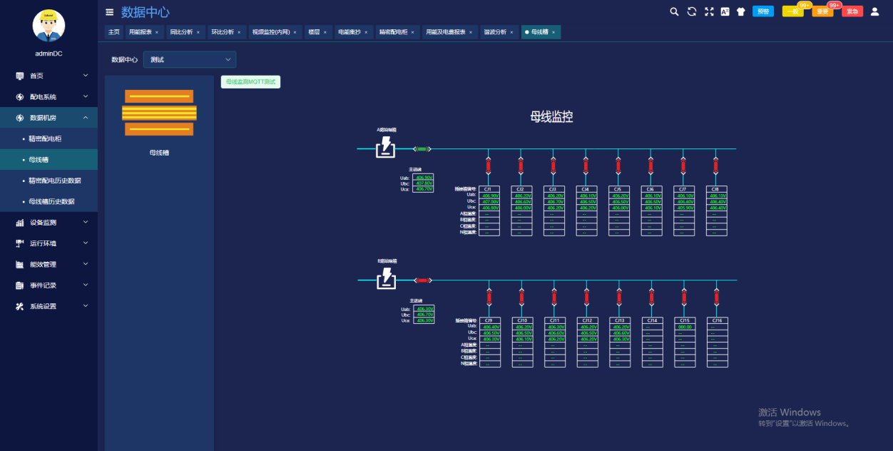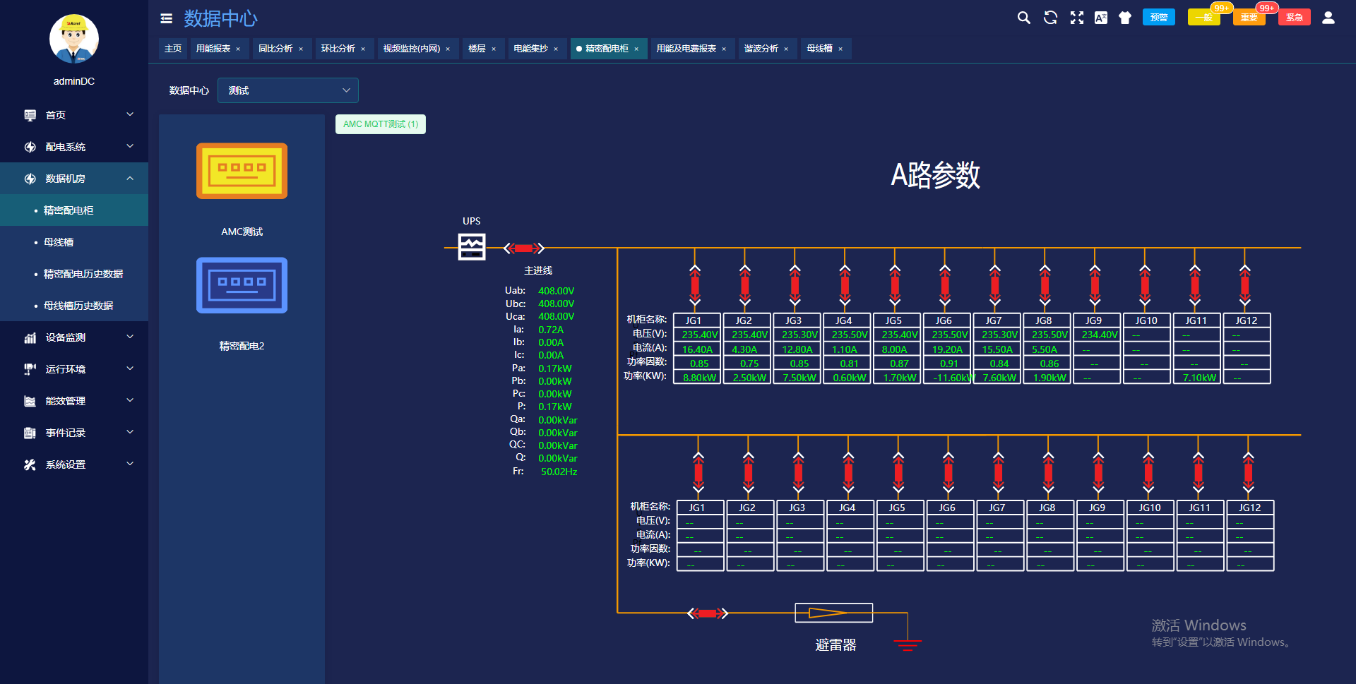 精密配電柜,通過SVG圖,將所有機柜的電壓,電流,功率,功率因數等參數顯示在圖中。