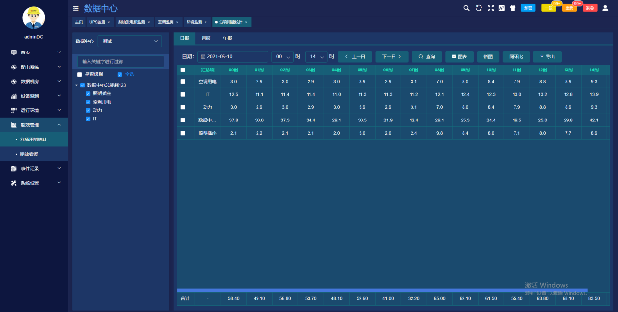 顯示當前數據中心,IT、空調、照明動力用電各時段的用電情況。