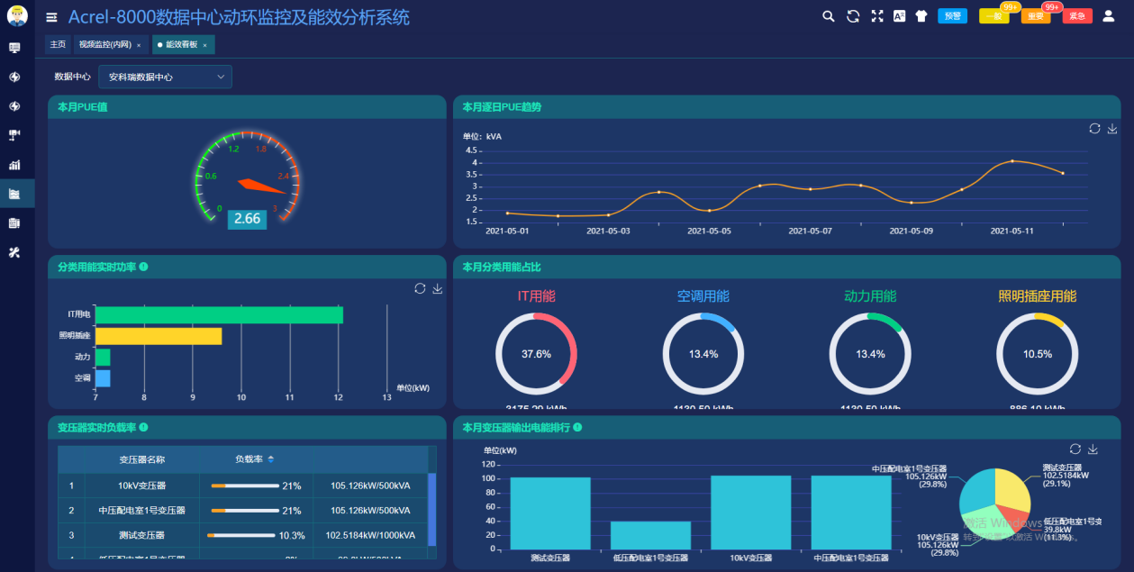 能效看板實時顯示當前數據中心PUE值以及歷史PUE曲線。并且顯示各分項用能的用能情況及用能排行。監測各變壓器運行及負載情況,給出本月變壓器輸出電能排行。