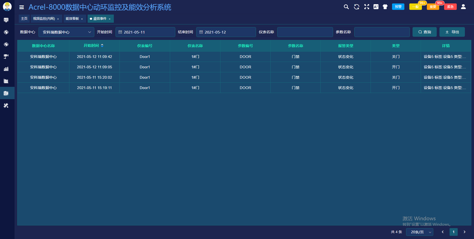 顯示當前數據中心各遙測量、如門禁、煙霧、水浸等狀態變化的報警情況。