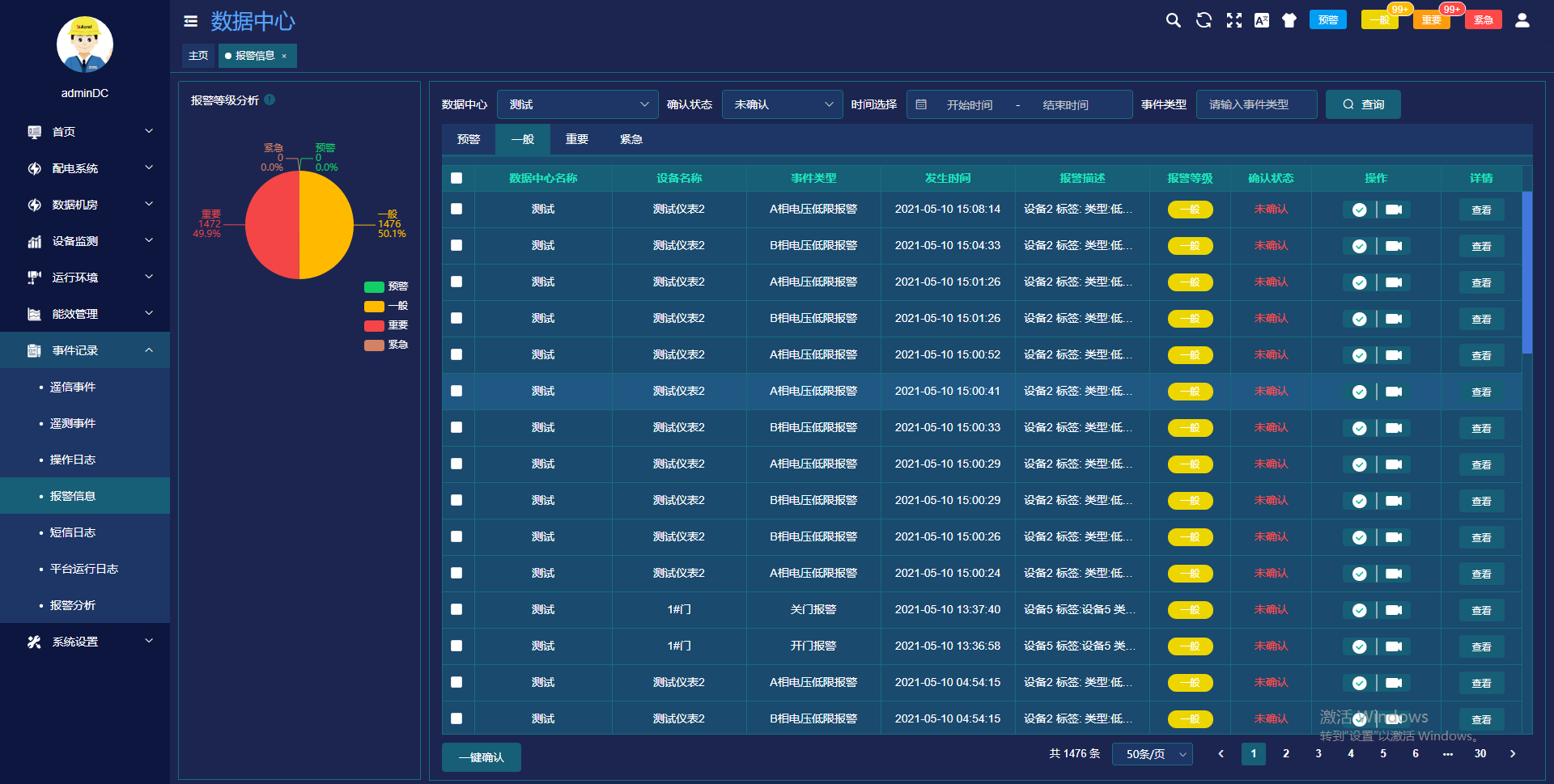 顯示當前數據中心下各報警的確認狀態,幫助用戶確認當前數據中心的運行狀態。提醒用戶有哪些存在的安全隱患。