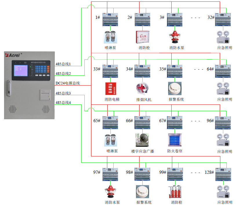 消防設備電源監控監控系統采用消防二總線,以建筑為單位設置區域分機采集消防設備電源狀態,區域分機通過二總線接收多臺傳感器的電壓、電流信息和開關狀態信息,以此實現對消防設備電源工作狀態的實時監視。
