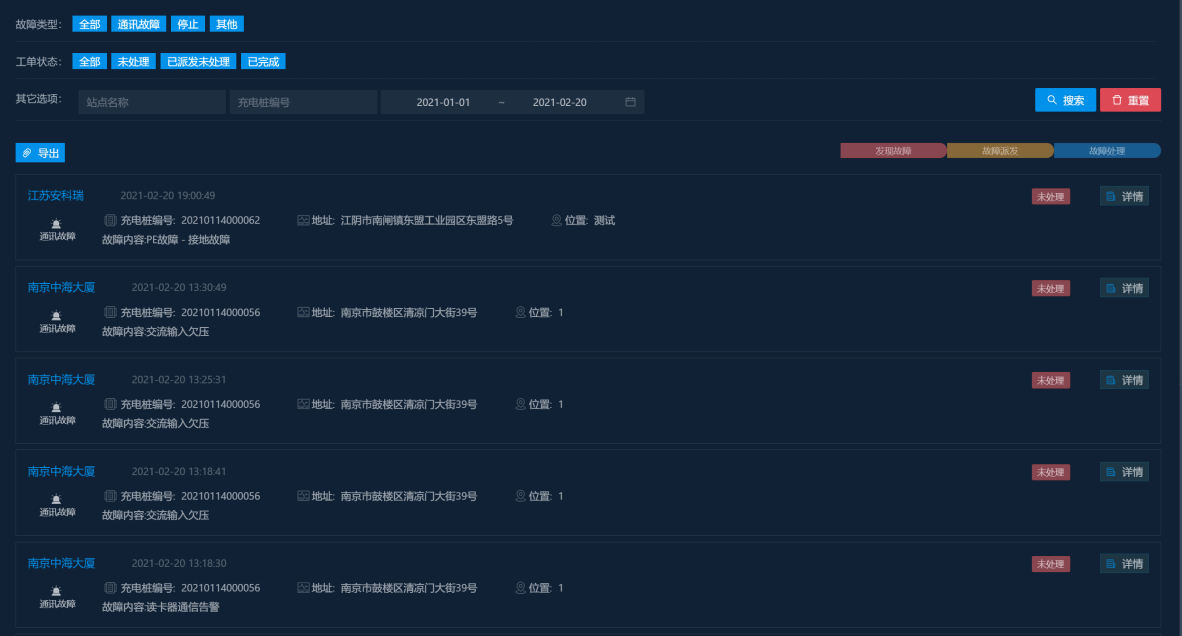 對(duì)平臺(tái)連接的所有充電樁狀態(tài)進(jìn)行監(jiān)視,充電樁發(fā)生異常情況時(shí)可通過APP、短信及時(shí)向運(yùn)營人員發(fā)出報(bào)警信號(hào),及時(shí)消除火災(zāi)隱患。