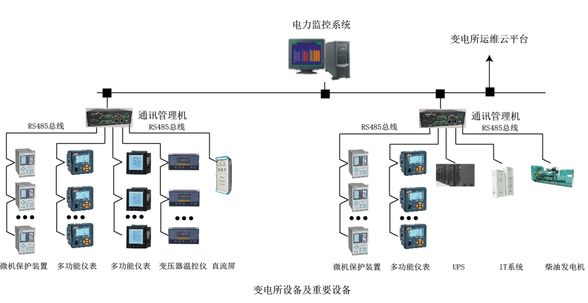 系統(tǒng)采用分布式結(jié)構(gòu),微機(jī)保護(hù)裝置、多功能儀表、變壓器溫控器、直流屏、柴油發(fā)電機(jī)控制屏等設(shè)備通過RS485總線或者以太網(wǎng)接入智能網(wǎng)關(guān),經(jīng)過協(xié)議轉(zhuǎn)換、數(shù)據(jù)處理后上傳至電力監(jiān)控系統(tǒng),實現(xiàn)遙測、遙信、遙控、異常報警等功能。